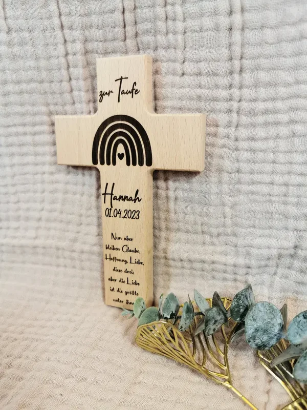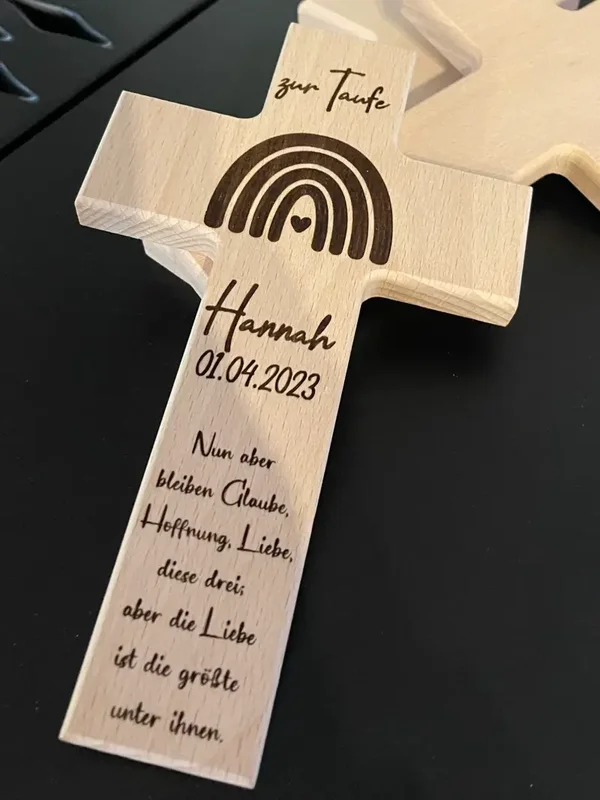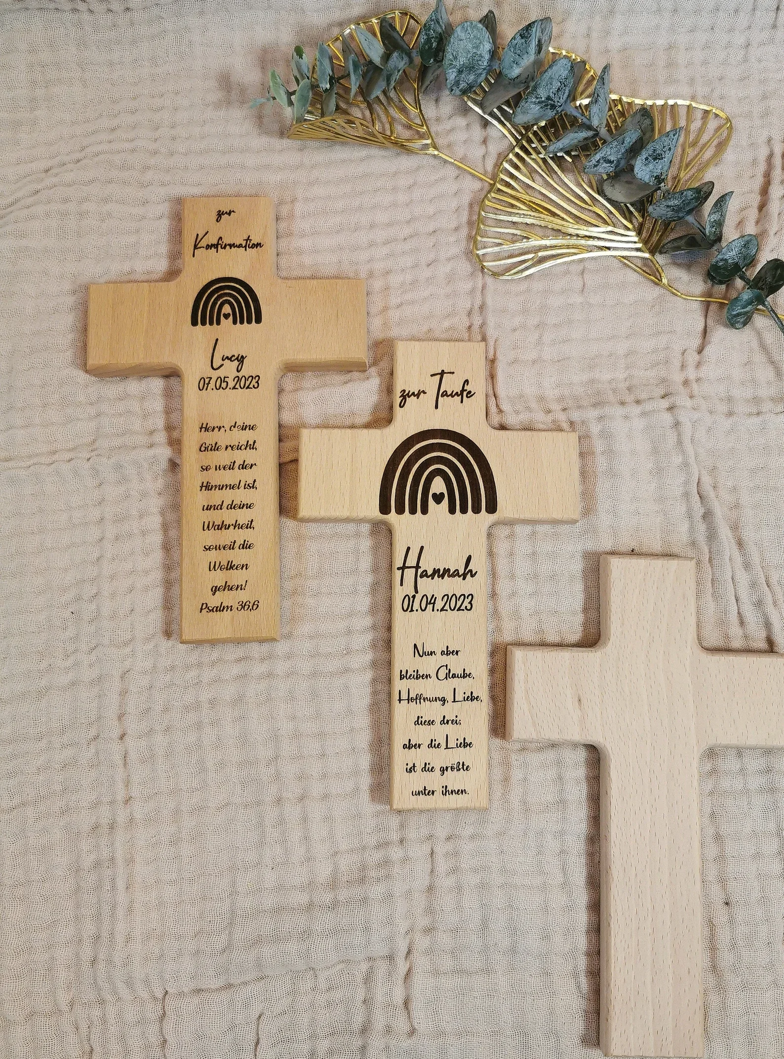 Ein personalisiertes Holzkreuz ist ein liebevolles und bleibendes Geschenk zu religiösen Anlässen wie Taufe, Kommunion oder Konfirmation – eine Erinnerung, die ein Leben lang Bestand hat.