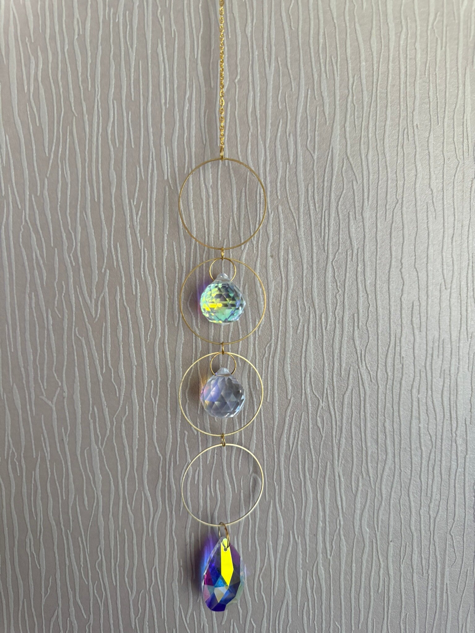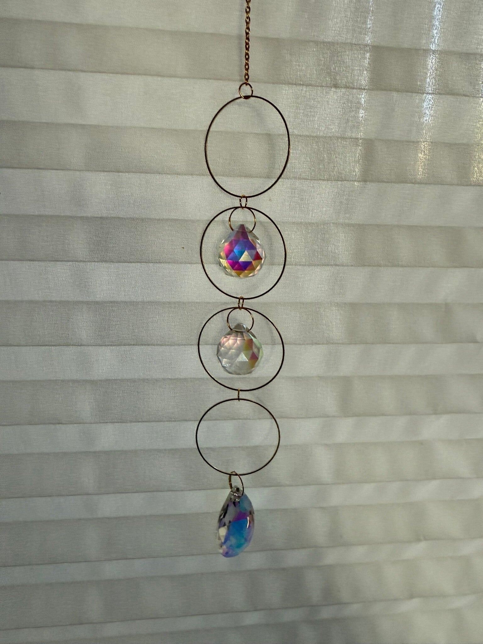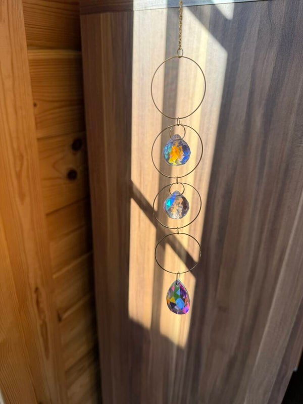 Dieser handgefertigte Sonnenfänger aus Metall und Kristall bringt strahlende Lichtspiele in dein Zuhause. Wenn Sonnenlicht auf die Prismen trifft, entstehen lebendige Regenbogen – perfekt als Fensterdeko oder Geschenkidee.