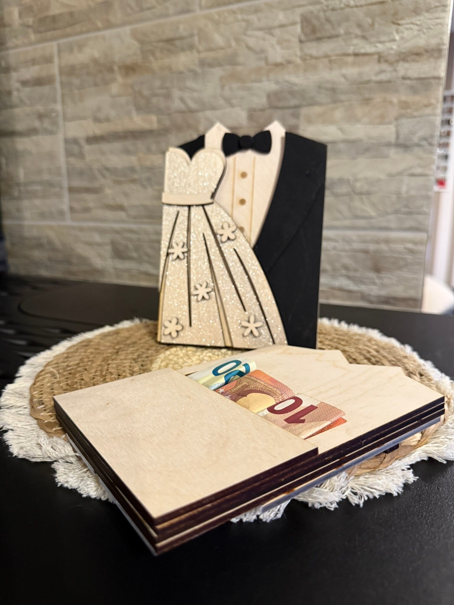 Wir bieten dir die Möglichkeit, auf der Rückseite über dem Einsteckfach eine Gravur anzubringen – etwa mit Namen, Hochzeitsdatum oder einem kleinen Spruch.