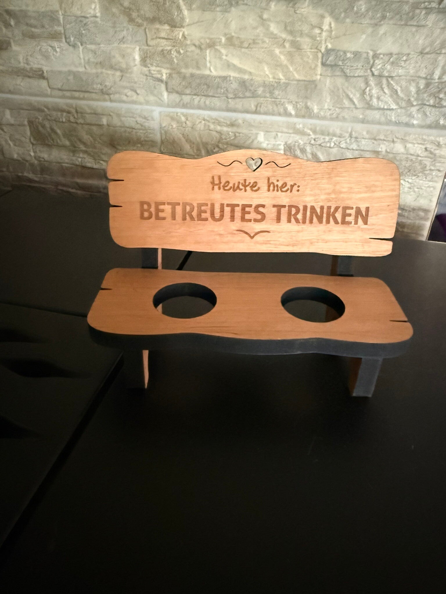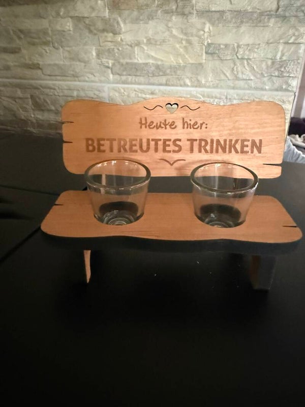 Holz-Schnapsbank mit Gravur „Heute hier: BETREUTES TRINKEN!“ – Massives Erlenholz, geölt