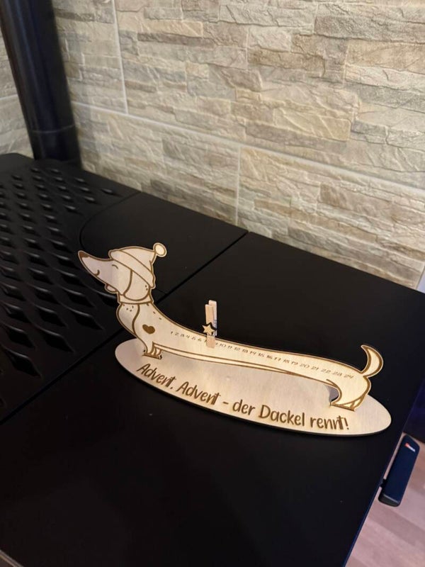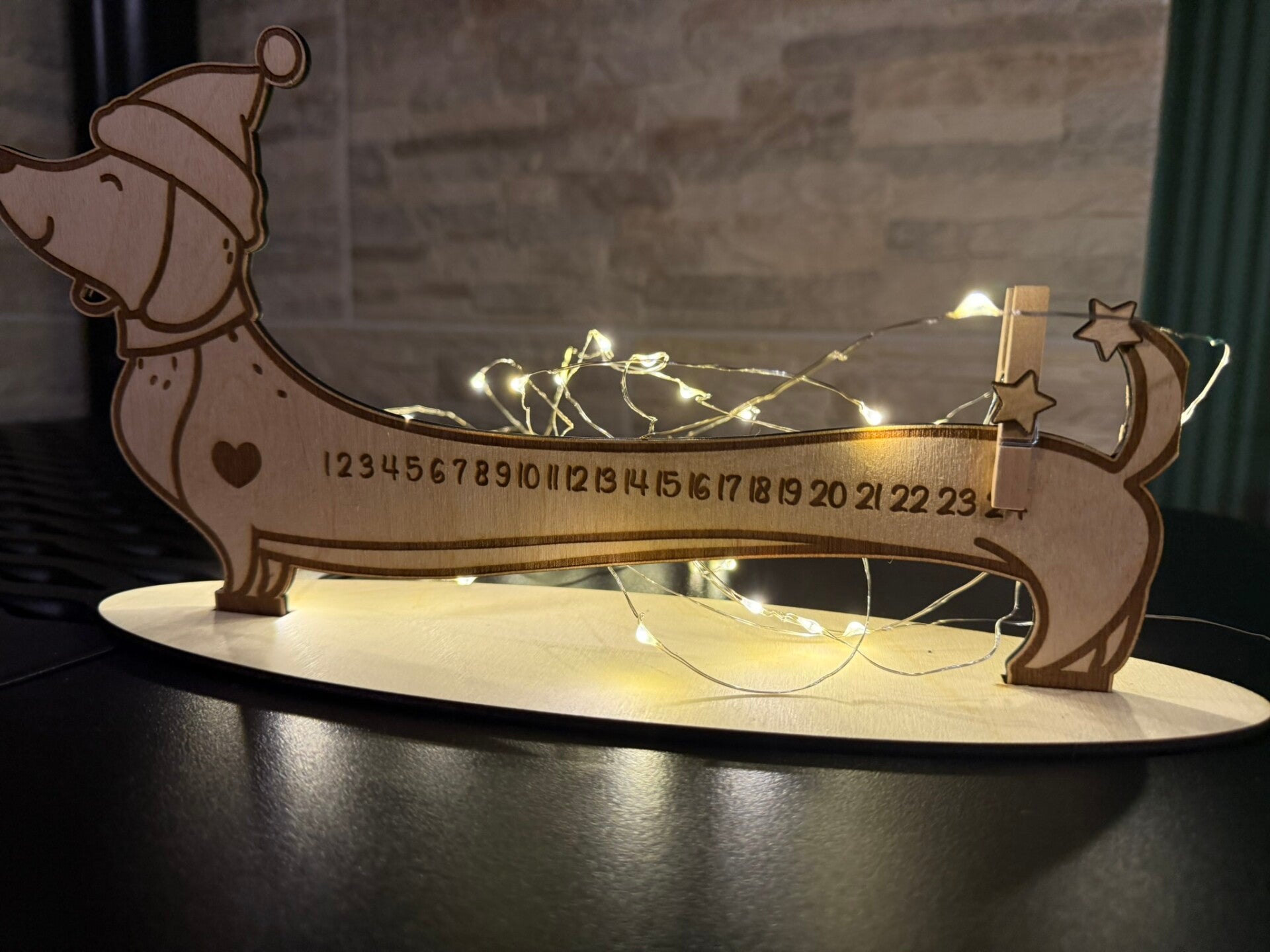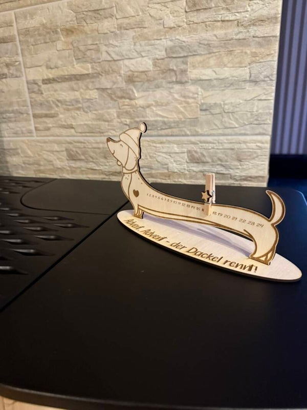 Auf seinem langen Körper sind die Zahlen 1 bis 24 – jeden Tag darfst du die kleine Klammer weiterschieben. So „rennt“ dein Dackel Tag für Tag Richtung Heiligabend.