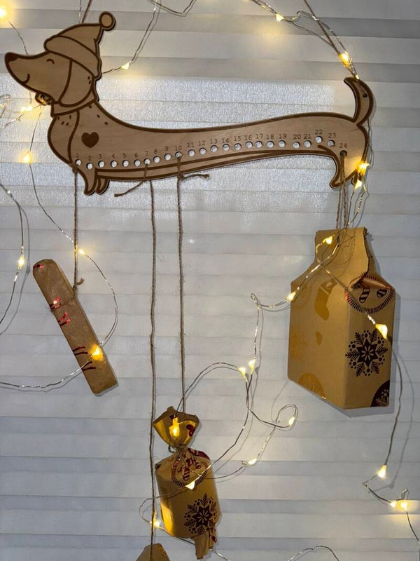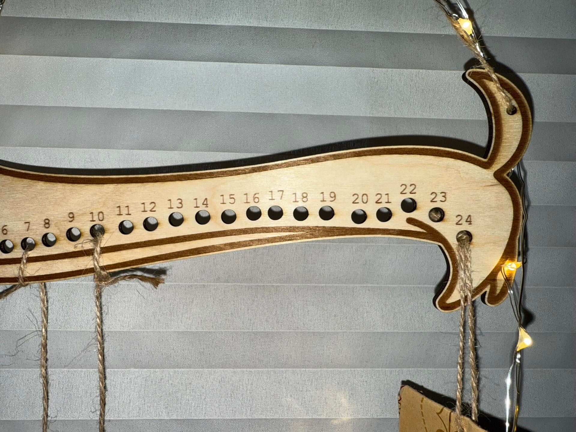 Er ist aus hochwertigem 5 mm Holz gefertigt, etwa 37 cm lang und mit 24 kleinen Löchern versehen, an denen du Geschenke oder kleine Aufmerksamkeiten befestigen kannst.